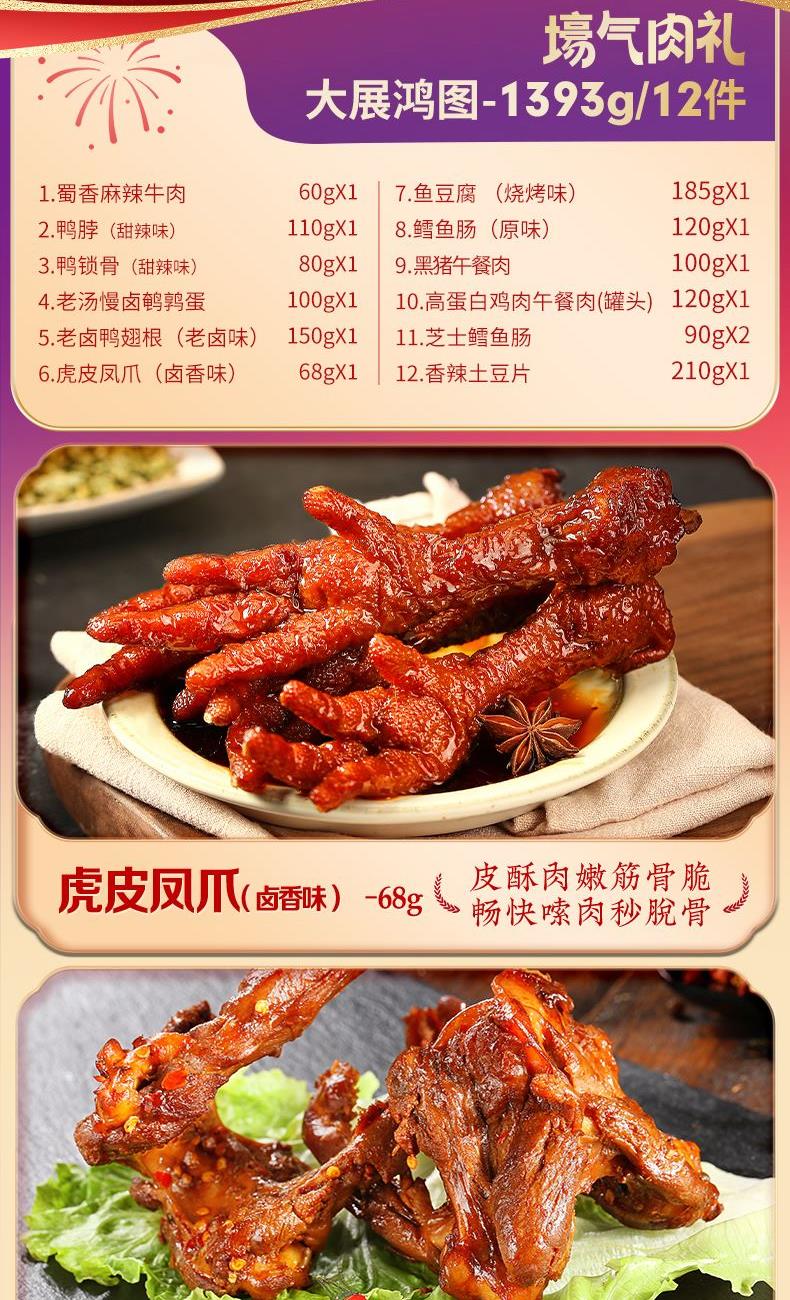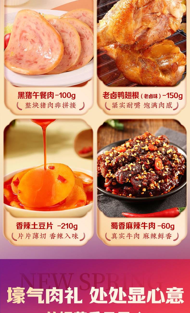 禮盒尺寸mm(長*寬*高):400*135*290 內配:蜀香麻辣牛肉60g 鴨脖 110g(甜辣味) 鴨鎖骨(甜辣味)80g 老湯慢鹵鵪鶉蛋-100g 老鹵鴨翅根(老鹵味)150g 虎皮鳳爪(鹵香味)68g 魚豆腐 185g(燒烤味) 鱈魚腸(原味)120g 黑豬午餐肉100g 高蛋白雞肉午餐肉(罐頭)120g 芝士鱈魚腸 90g 香辣土豆片 210g