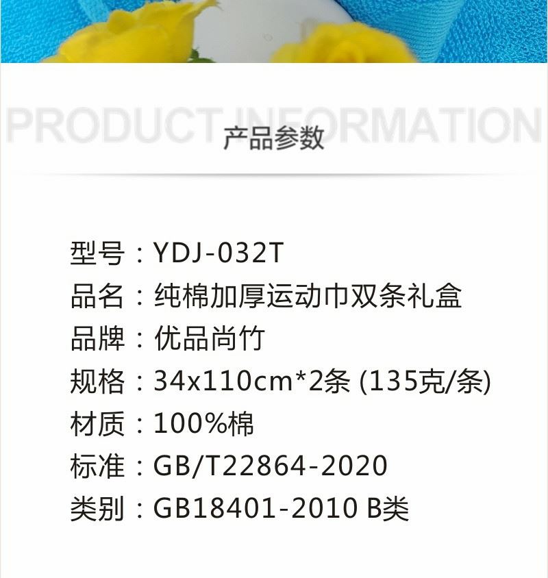 產(chǎn)品內(nèi)容:純棉加厚運(yùn)動(dòng)巾×2 產(chǎn)品克重:135克 產(chǎn)品尺寸:34*110CM 成份:精梳棉 禮盒: 29.5×15×7cm