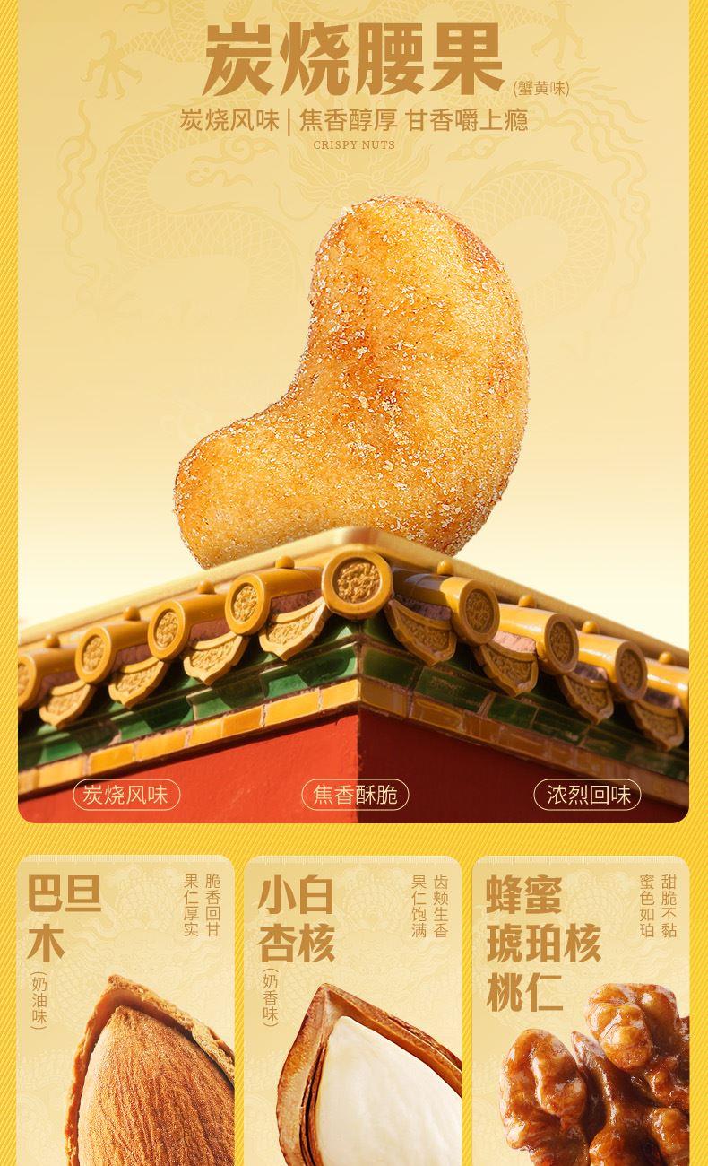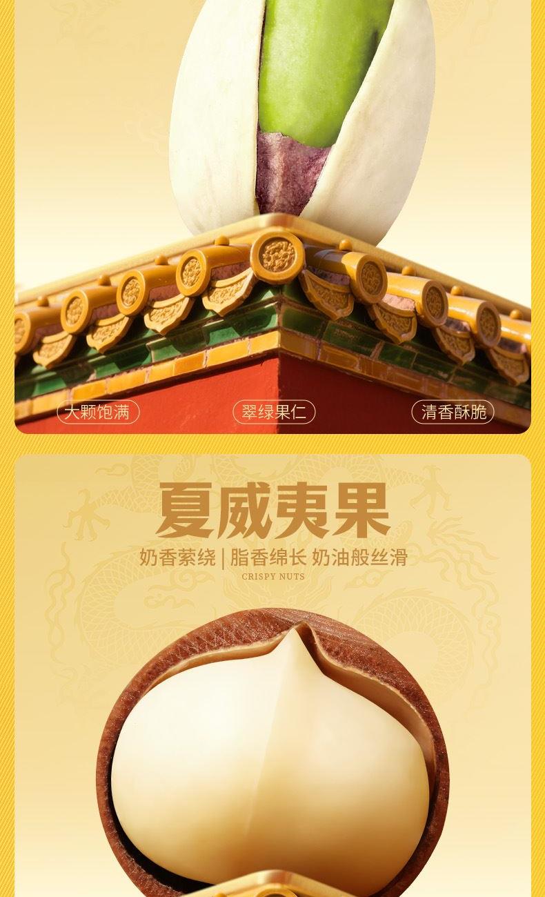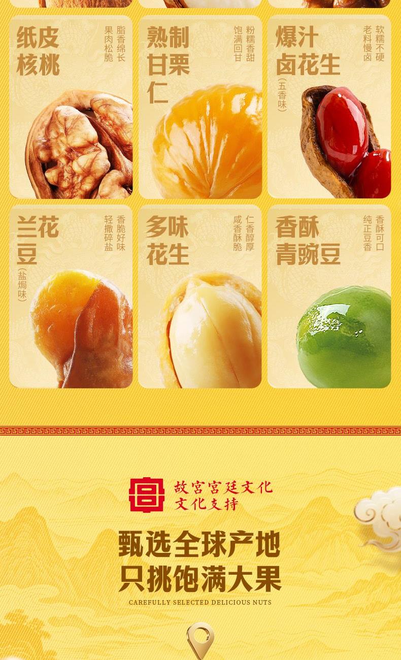 禮盒尺寸mm(長(zhǎng)*寬*高):480*180*230 東北松子 60g 開(kāi)心果 60g 炭燒腰果(蟹黃味)100g 碧根果(奶油味) 100g 夏威夷果(奶油味) 100g 巴旦木(奶油味)100g 小白杏核(奶香味)100g 紙皮核桃 100g 蜂蜜琥珀核桃仁 100g 熟制板栗仁 60g 爆汁鹵花生(五香味)228g 多味花生 210g 蘭花豆(鹽焗味)210g 香酥小豌豆(蒜香味) 210g