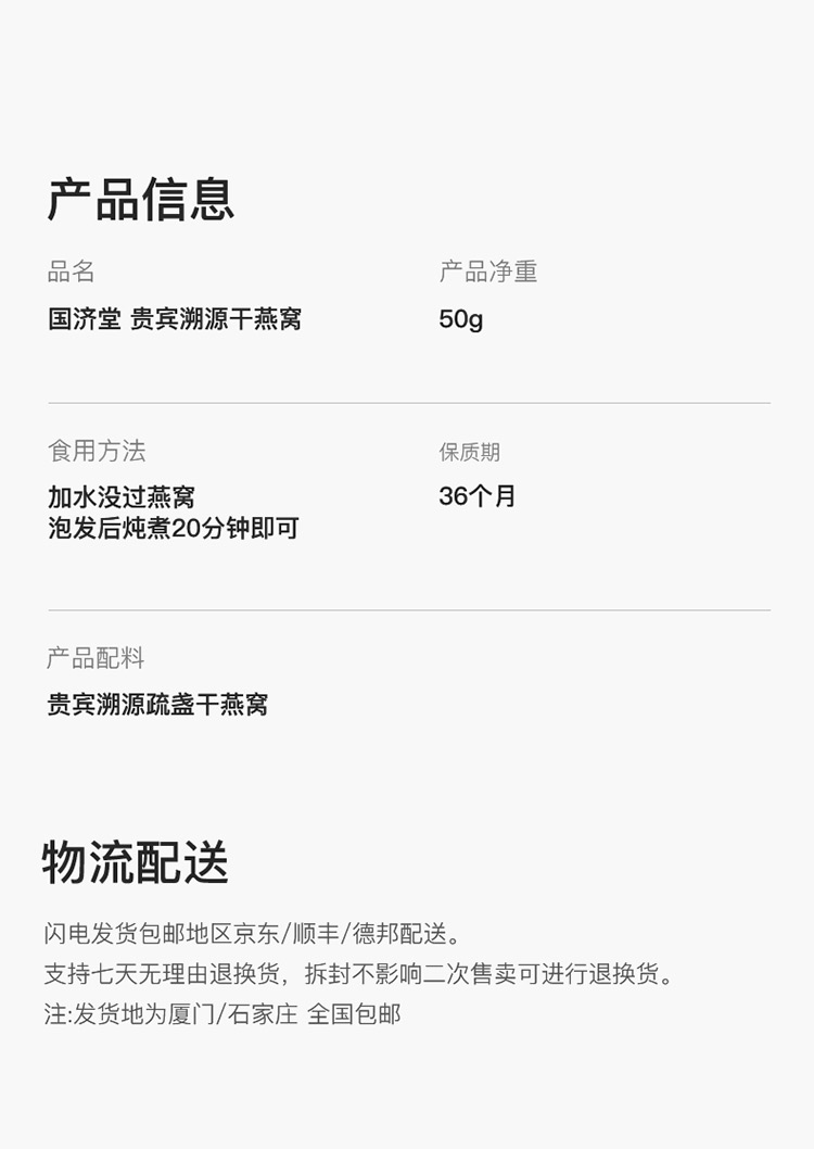 產(chǎn)品規(guī)格:50克疏盞溯源干燕窩 原料:印尼溯源干燕窩 食用方法:加水沒(méi)過(guò)燕窩泡水2小時(shí)以上燉煮 保質(zhì)期:36個(gè)月