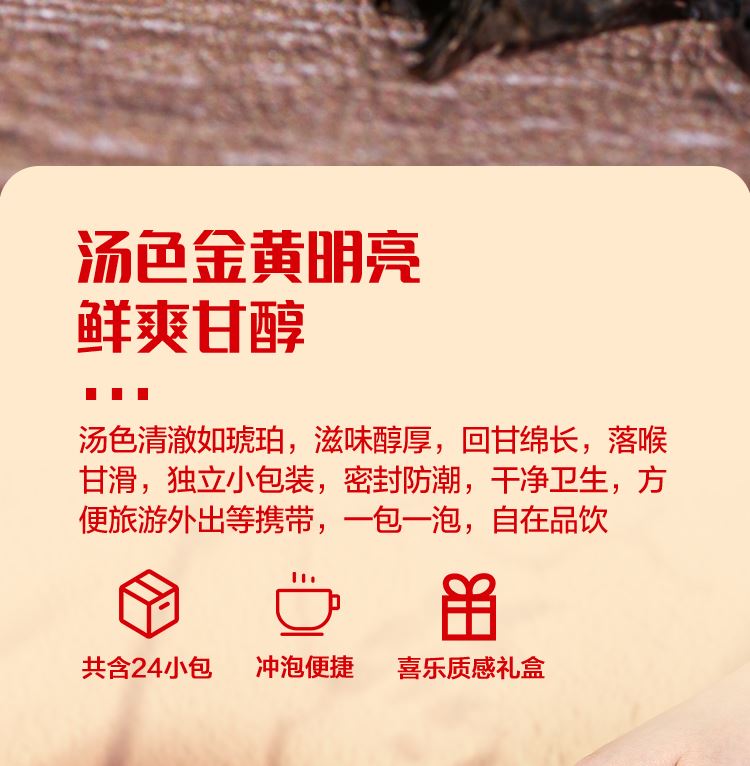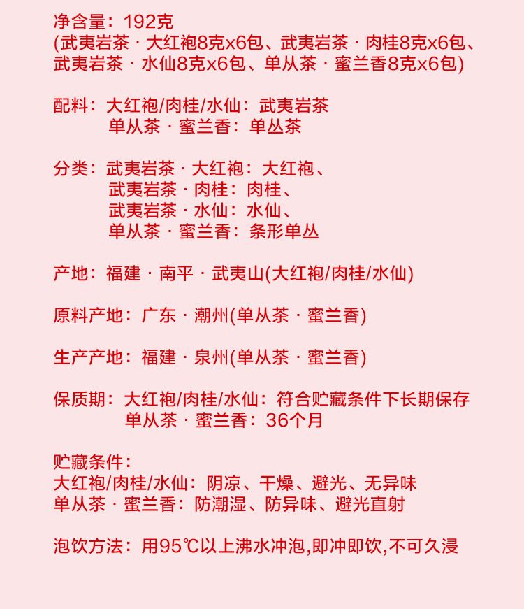 凈含量:192克 (武夷巖茶·大紅袍8克x6包、武夷巖茶·肉桂8克x6包、 武夷巖茶·水仙8克x6包、單從茶·蜜蘭香8克x6包) 產(chǎn)地:福建·南平·武夷山(大紅袍/肉桂/水仙) 生產(chǎn)產(chǎn)地:福建·泉州(單從茶·蜜蘭香) 保質(zhì)期:大紅袍/肉桂/水仙:符合貯藏條件下長(zhǎng)期保存 單從茶·蜜蘭香:36個(gè)月 貯藏條件: 大紅袍/肉桂/水仙:陰涼、干燥、避光、無(wú)異味 單從茶·蜜蘭香:防潮濕、防異味、避光直射 泡飲方法:用95℃以上沸水沖泡,即沖即飲,不可久浸 凈含量:1098克 產(chǎn)品內(nèi)配: 經(jīng)典椰子卷80克(8包) 烏龍茶粗糧餅干 288克(15包) 鐵棍山藥核桃酥 250克(10包) 洛神花雪梨黃油曲奇 296克(16包) 紅茶黃油蛋糕64克(4包) 伯爵紅茶華夫餅120克(4包) 產(chǎn)地:廣東東莞 保質(zhì)期:6個(gè)月 貯藏條件:請(qǐng)置于陰涼干燥處