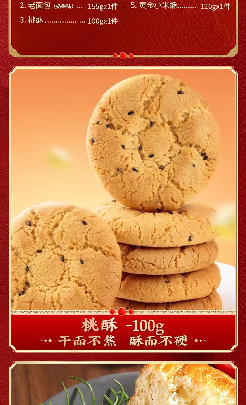 禮盒尺寸mm(長(zhǎng)*寬*高):400*135*290 內(nèi)配:手撕面包 280g 老面包(奶香味)155g 桃酥100g 小圓餅干 100g(海鹽味) 小小酥 120g